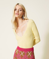 Actitude collection viscose blend ribbed bodysuit with V neck, long sleeves and cut-out with straps on the back.