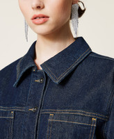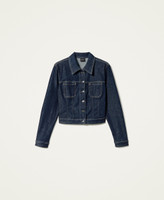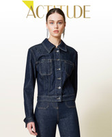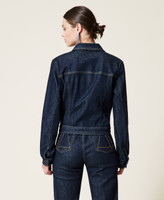 Actitude collection rinsed denim jacket with tobacco coloured stitching, shirt collar, logo stud button closure.