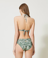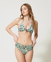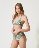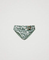 High leg bikini bottom with leaf print, belt loops, belt, mock horn buckle, logo, lining.