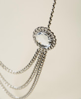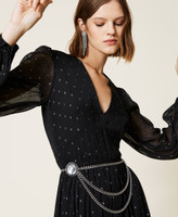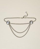Jewel belt with chains and maxi crystal bezels, adjustable closure via clasps.