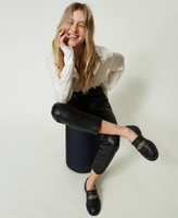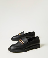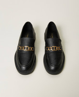Leather loafers with gold-tone galvanized Oval T chain, rubber sole.