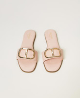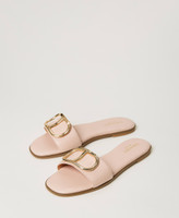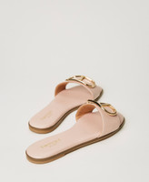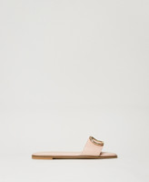 Leather slides with gold-tone galvanized Oval T logo in front, tunit sole.