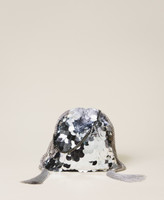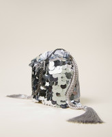 Actitude collection satin bucket bag with sequins on the front panel, drawstring with tassel, chain strap.