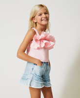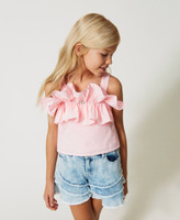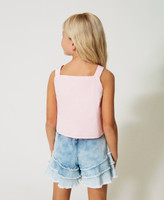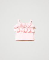 Short taffeta top with shoulder straps, gathered flounce in front, metal Oval T appliqué at the centre, cotton muslin lining.