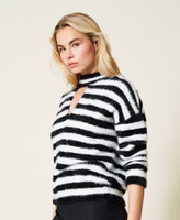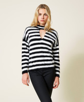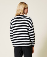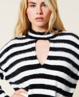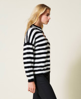 Evergreen stripes for this long fibre yarn jumper. Crew neck with teardrop opening, wide sleeves with slouched shoulders, boxy fit, two-tone jacquard knit label with Twinset Milano logo at the centre of the rear side. A garment that can be easily matched in many outfits.