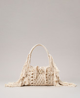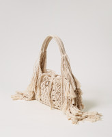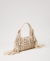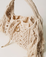 Shopper made in Italy from hand-woven cotton cord with fringes. Featuring tie-fastening with laces trimmed with metal ends, a double handle for carrying by hand or on the shoulder, and an inner canvas bag.