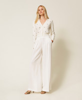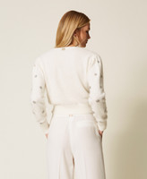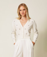 Angora blend plain knit cardigan with riveted rhinestone flowers. V neck, long sleeves, covered button fastening, Oval T logo plate covered in thread at the back, loose fit.