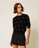 Angora blend plain knit jumper with riveted rhinestone flowers. Crew neck, short sleeves, Oval T logo plate covered in thread at the back, loose fit.