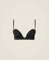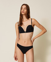 Shiny stretch jersey padded bikini top. Heart-shaped cups with non-removable padding, underwire and side boning, removable and adjustable branded elastic shoulder straps, three-hook fastening at the back, internal silicone rim for better support, Oval T metal logo at the front.