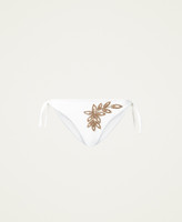 Bikini thong with thread and sequin embroidery, adjustable laces on the side, logo plate on the back.