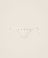 Double-layered fabric bikini thong with waist decorated with baguette rhinestone and pearl floral embroidery. Fastened with ties at the sides, heart-shaped metal logo on the back.