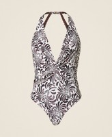 One-piece swimsuit with a Twinset-exclusive botanical print, deep crossover neckline and pleats, tie-up laces behind the neck, bare back, heart-shaped metal logo on the back.
