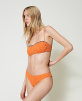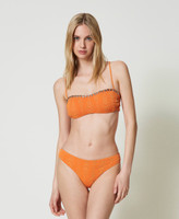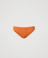 Brazilian bikini bottom with embossed design, stitching on the back, solid colour lining and heart-shaped metal logo on the back.