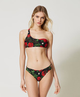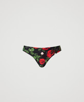 Rose print Brazilian bikini bottom with asymmetric patch embroidery and contrasting lining.