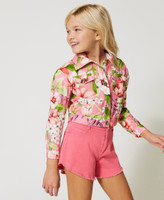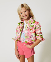 Bull jacket with floral print all over, metal logo buttons, long sleeves with pleat on the shoulder, flap pockets.
