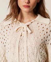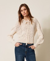 Stretch knit jumper made from 75% certified organic cotton and 25% certified recycled polyamide. Plain knit with cable stitch and openwork patterns. Polo collar and opening with criss-cross laces, long sleeves, ribbed trims, loose fit. Any micro-impurities are typical of recycled and organic materials.