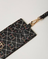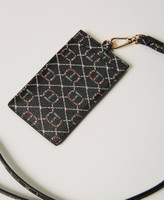 Saffiano print leather-like card holder with asymmetric compartments, removable strap with carabiner, metal Oval T logo.