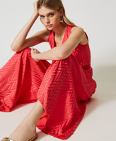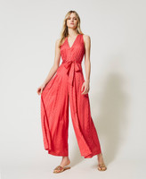 Long jumpsuit made from jacquard viscose with matt/shiny effect, V neck and matching belt.