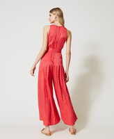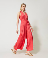 Magnetic texture for this jacquard viscose jumpsuit with matt/shiny effect chevron pattern. Straight fit, V neck, wide trousers with sewn pleats on the sides, invisible rear zip, matching belt. Simply add high heels and clutch for an evening of top glamour.