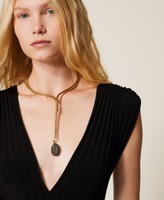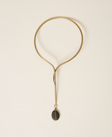 Brass choker necklace with stone pendant and engraved logo. The metal is flexible for easy wear.