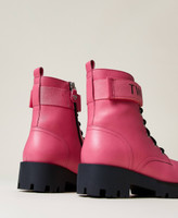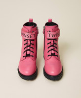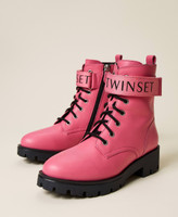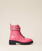 Leather lace-up combat boots with velcro logo strap, side zip and rubber sole.