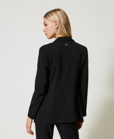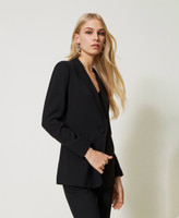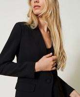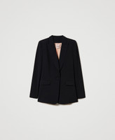 Stretch crêpe cady blazer with lapels, covered single button closure, contrasting lining.
