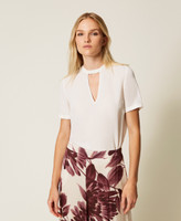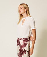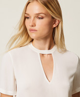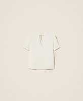 Crêpe de Chine blouse with V-shaped cut-out on the front. Round neck, short sleeves, teardrop opening with button on the back, loose fitting.