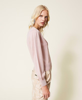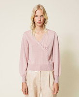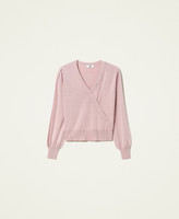 Wool blend jumper with criss-cross in front, small decorative buttons, pleats, wide sleeves tightened at the cuff.
