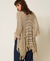 Viscose crochet knit poncho with lurex. Fringed hem, fastened with a tubular knit belt.