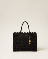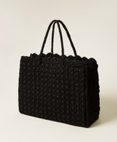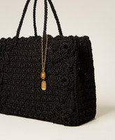 Hand crocheted cotton shopper bag with three-dimensional floral embroidery on the front panel. Double handle to be carried or worn on the shoulder, tonal embroidered logo, brass-coloured metal charms with logo. Inside it has a removable canvas bag with drawstring.