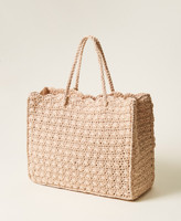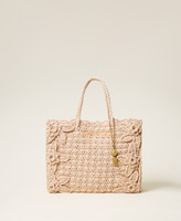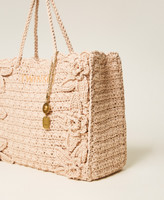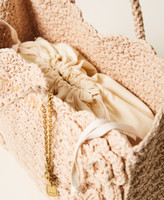 Hand crocheted cotton shopper bag with three-dimensional floral embroidery on the front panel. Double handle to be carried or worn on the shoulder, tonal embroidered logo, brass-coloured metal charms with logo. Inside it has a removable canvas bag with drawstring.