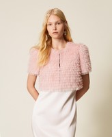 Cropped tulle jacket with micro ruffles, round neck, short sleeves, fitted fastening with concealed hooks, lining, slim fit.