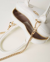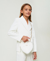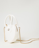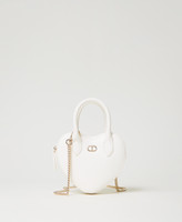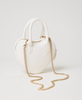 Heart-shaped, leather-like shoulder bag with removable metal strap, double handle, zip closure.