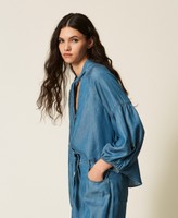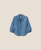 Actitude collection shirt made from TENCEL(TM) denim with V neck with bow, snap button fastening at the front, wide sleeves gathered at the armholes and cuffs, loose fit.