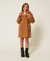 Girls' faux fur coat with wide lapels, double-breasted fastening with buttons, patch pockets on the front, long sleeves with slouched shoulders, lining, wide fit.