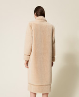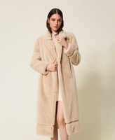 Faux fur long coat with decorative inserts at the trims. Lapels, long sleeves, inset side pockets, double-breasted tonal button fastening, lining, Oval T logo plate at the back, straight fit.