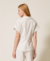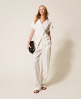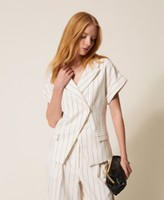 Actitude collection viscose blend pinstripe fluid fabric tailored jacket. Lapels, double-breasted fastening with button, short sleeves with turn-ups, flap pockets, slim fit.