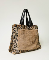 Faux fur shopping bag with animal print and solid colour insert in front, double handle, magnet closure.
