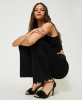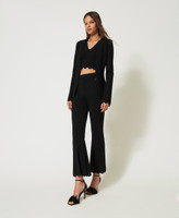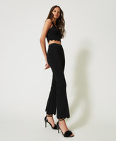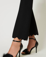 Stretch viscose knit trousers with crêpe feel, elasticated waistline, scalloped hem, flared.