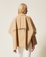 Cotton gabardine poncho with a trench coat design. Shirt collar, horn effect button fastening, storm flaps at the front, patch pockets, button fastened sides, wide fit.