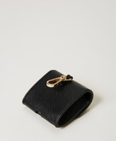 Headphone holder made from saffiano print leather-like material, with flap and snap button, metal Oval T logo, carabiner.
