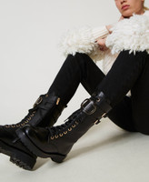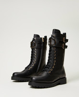 Lace-up leather combat boots with metal eyelets, double buckle at the side and tonal varnished Oval T, rubber lug sole.