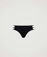 Jacquard Brazilian bikini bottom with lurex Oval T all over, side laces with metal tubes.