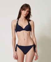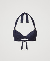 Jacquard push-up bikini top with a leaves and flowers pattern and irregularly shaped gold-tone rings. Padded with non-detachable cups, underwired, with laces that tie behind the neck or work as shoulder straps thanks to the eyelets at the ends, with tie fastening on the back.