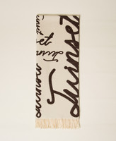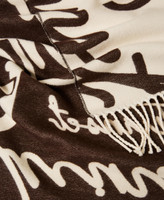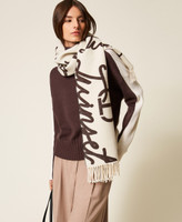 Two-tone jacquard wool cloth stole with lettering logo and fringed hem.