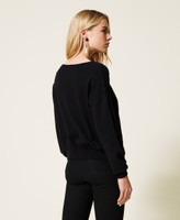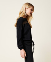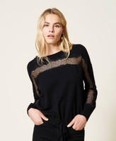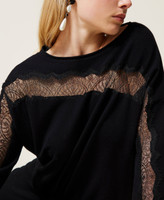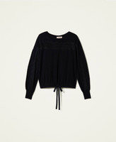 Jumper made of viscose blend yarn with warm feel, with inlaid lace at the yoke and sleeves, drawstring at the hem.