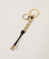 Keyring with weaved nappa-like tubular, enamelled lettering logo and metal tips, ring and carabiner.