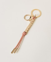 Keyring with weaved nappa-like tubular, enamelled lettering logo and metal tips, ring and carabiner.