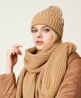 Ribbed knit beanie with crystal bead embroideries and fold.