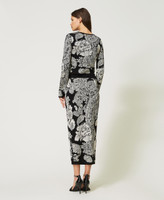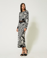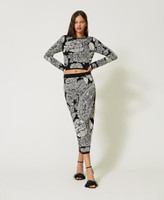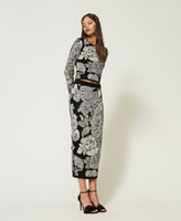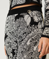 Knit midi skirt made from shiny stretch viscose with pique jacquard paisley and rose pattern, straight fit, ribbed elastic at the waist, unlined.